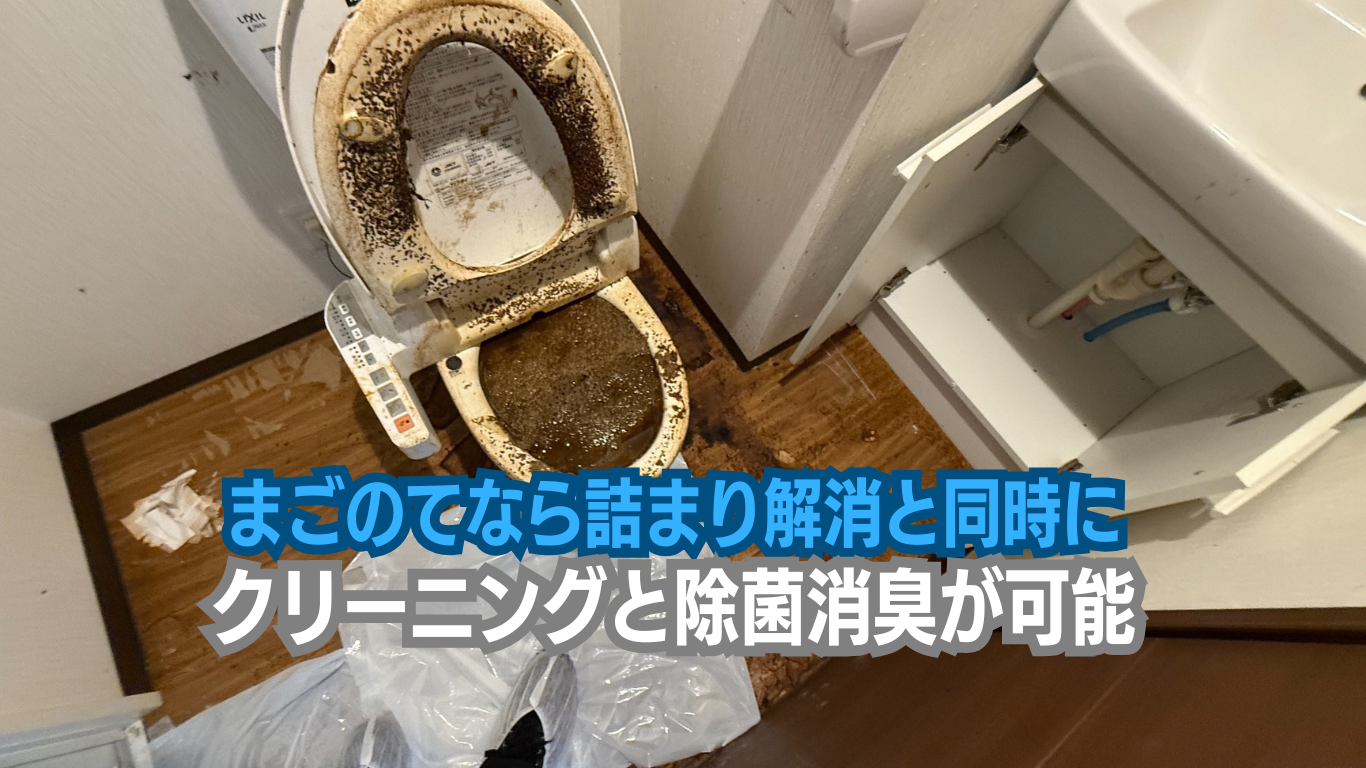 まごのては特殊清掃業者ですので排水管が詰まって汚水が逆流した部屋の清掃や除菌消臭も同時に施工できるほか、ゴミ屋敷状態でトイレ詰まりやお風呂の排水詰まりを起こした際もクリーニングとセットで行えます。